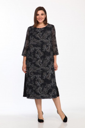 Платье прямого силуэта, с круглым вырезом горловины, двухслойное. Перед с нагрудными вытачками, завязочками по бокам. Рукава втачные, одношовные, длиной 3/4. Размеры 52-54: длина платья 118 см, длина рукава 44 см. Размеры 58-62: длина платья 122 см, длина рукава 46 см