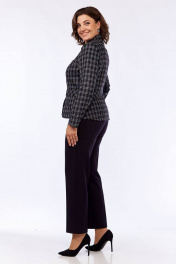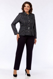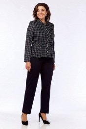 Костюм женский 2-ух предметный, состоящий из жакета и брюк. Жакет женский полуприлегающего силуэта, из текстильного материала, на подкладке. Перед с рельефными швами, идущими от проймы до низа, отлетными карманами с тесьмой - "молнией". Центральная застежка на петли и пуговицы с отрезными планками. Спинка со средним швом, настрочным поясом-кулиской с поясом с пряжкой. Воротник рубашечного типа с отрезной стойкой. Брюки женский прямые, слегка заужены книзу.Центральная застежка на тесьму - "молнию" и 2 петли и пуговицы по поясу. Заднии части брюк с талиевыми вытачками. Верхний срез брюк обработан притачным поясом - обтачкой со шлевками. По передним частям брюк кант. Размеры 40-44: длина жакета 61 см, длина рукава 61 см, длина брюк 94 см. Размеры 46-50: длина жакета 63 см, длина рукава 62 см, длина брюк 96 см.