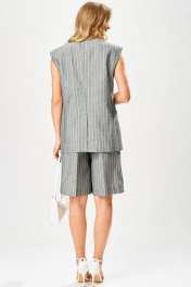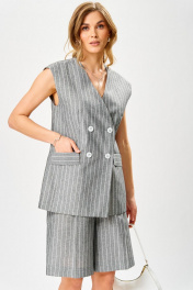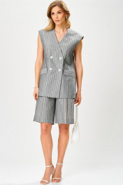 Комплект из костюмной ткани в полоску,состоящий из жилета и бермуд.Жилет женский, полуприлегающего силуэта, на подкладке, длиной ниже линии бедер, с центральной сквозной двубортной застежкой на 2 петли и 2 пуговицы, 2 декоративные пуговицы, и 1 потайную петлю и пуговицу. Детали переда жилета с отрезными бочками, центральные части с нагрудными вытачками, с прорезными горизонтальными карманами с клапанами. Деталь спинки жилета с рельефными швами и плечевыми вытачками, со средним швом, который заканчивается шлицей. Вырез горловины жилета «V-образной формы». Жилет с притачной понизу подкладкой. Бермуды прямые к низу, с притачным поясом, по боковым частям пояса вставлена эластичная тесьма. Застежка на тесьму-молнию и 1 петлю и пуговицу. На передних половинках обработаны по 1 складке, в боковых швах – наклонные карманы. На задних половинках обработаны по 1 вытачке на каждой половинке. На передних и задних половинках заутюжены «канты». На поясе прикреплены 5 шлёвок. Жилет: длина плеча - 17см, длина спинки – 70см. Бермуды: длинапо боковому шву – 53см