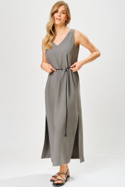 Платье женское из вискозной ткани, полуприлегающего силуэта,прямое книзу, длиной до середины икр, в боковых швах обработаны разрезы, со съемным поясом из декоративной тесьмы. Деталь переда платья с нагрудными вытачками. Вырез горловины – «V-образной» формы. Платье: длинасередины спинки – 130см.