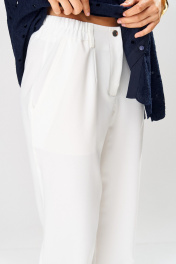 Комплект женский (блузка и брюки). Блузка хлопковая женская, прямого силуэта, длиной ниже линии бедер, с втачными рукавами, с разрезами в боковых швах, с втачной бейкой, с центральной сквозной застежкой на 6 петель и 6 пуговиц, со съемным поясом. Детали переда блузки на подкладке, с притачными планками, с нагрудными вытачками. Деталь спинки блузки с отрезной кокеткой, по центру - сборка. Рукава втачные одношовные, длиной ¾, с притачными манжетами, в которые вставлена эластичная тесьма. Вырез горловины блузки «V-образной» формы, по горловине втачная бейка. Брюки прямые из поливискозы, с притачным поясом, по спинке пояс фигурной формы. Застежка на тесьму-молнию и 1 кнопку. На передних половинках брюк обработаны по 1 вытачке на каждой половинке, в боковых швах наклонные карманы. На задних частях брюк обработаны по 1 вытачке на каждой половинке. На передних и задних половинках брюк заутюжены «канты». На поясе прикреплены 4 шлёвки. Блузка: длина рукава (с манжетой) – 45см, ширина рукава – 21см, длина спинки – 72см. Брюки: длина по боковому шву – 102см.