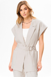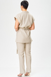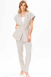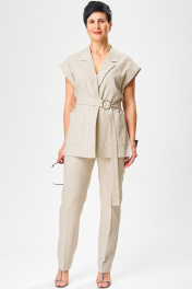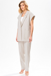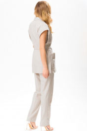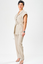 Комплект брючный,летний из льносодержащей ткани. Жилет женский, полуприлегающего силуэта,на подкладке, длиной ниже линии бедер, с втачным воротником, с разрезами в боковых швах, с центральной сквозной застежкой на 2 потайные кнопки до линии перегиба лацкана, со съемным поясом. Детали переда жилета с нагрудными вытачками, исходящие от низа, с накладными карманами. Деталь спинки жакета с плечевыми вытачками и со средним швом. По проймам расположены манжеты фигурной формы, с отворотам на изделие. Воротник отложной пиджачного типа. Углы воротника и лацканов острые. Края воротника, лацкана, борта, обработаны в чистый край. Жилет с притачной понизу подкладкой. Брюки на бедрах, плотно облегающие вверху и зауженные к низу, с притачным поясом,по спинке в пояс вставлена эластичная тесьма. На передних половинках брюк в боковых швах обработаны наклонные карманы. На передних и задних половинках брюк заутюжены «канты». На поясе прикреплены 5 шлёвок. Декор может отличаться от представленного на фотографии. Жилет: длина плеча – 22,5см, длина спинки – 74см. Брюки: длинапо боковому шву – 102см.