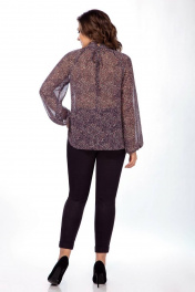 Блузка из полупрозрачного шифона, свободного силуэта, воротник - плосколежащая стойка+ рюша, по окружности стойки – сборка сзади и разрез и фиксация лентами. Рукав длинный, на основе реглана, расширен к низу и присобран на резиночку. Длина блузки сзади по спинке 65 см, длина рукава 67 см