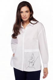 Рубашка из х/б ткани средней длины, прямого силуэта. Воротник на стойке. Впереди потайная застежка под планкой на пуговицы. Нагрудные вытачки, на левой стороне внизу подрез со складкой и авторская печать. Спинка чуть ниже переда. Линия плеча приспущена, рукав длинный. При желании можно подвернуть рукав до длины ¾ и зафиксировать патой на пуговицу. Брюки из костюмной ткани, довольно свободные сверху и слегка заужены к низу. На уровне талии оформлены притачным поясом (по бокам резинки), застежка «молния» + пуговица. У боковых швов - внутренние карманы, чуть укорочены.