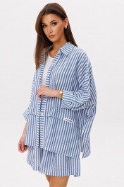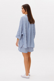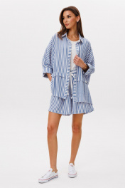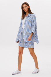 Стильный легкий комплект, состоящий из блузона стиля oversize, майки и шорт современного свободного силуэта. Подходящий вариант на предстоящее лето! Блуза рубашечного покроя с объемом oversize со спущенной линией плеча «а-ля летучая мышь». Спинка состоит из горизонтальной кокетки и основной детали, по центру с бантовой складкой для свободы движения. Спереди на основных деталях полочки горизонтальные склады-планки, глубиной 4,5 см. На складке слева расположена декоративная деталь: нашивка. Горловина оформлена стойкой и рубашечным воротником. Застежка вертикальная на планках петли-пуговицы. Длина блузы по спинке 77 см, длина блузы переда 73 см. Рукав цельнокроенный, на спинке со складками, завершен зауженной манжетой высотой 11 см, которая может иметь положение манжет с отворотом. Длина рукава от боковой плечевой точки до манжеты 51 см. Майка прямого силуэта без рукавов. Горловина округлой формы. Край проймы и край горловины обработан окантовочной бейкой. Ширина плеча 8,5 см. Длина изделия по спинке от плечевого шва 67 см. Шорты современного свободного силуэта. Карманы-хулиганы расположены в боковых швах. Спереди и сзади по линии талии расположены неглубокие модельные складки. Пояс притачной, высотой 5,5 см. В пояс вставлена эластичная тесьма (резинка), высотой 3,5 см. Длина изделия шорт по боковому шву 41-43 см. (фурнитура может отличаться от представленной на рекламном фотоматериале) Особые рекомендации: рекомендуется холодная деликатная ручная стирка, без использования отбеливающих СМС, без интенсивного трения. Сушка в вертикальном положении. ВТО с минимальным паром.