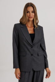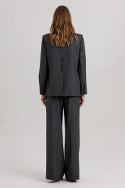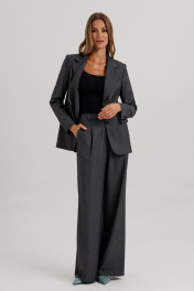 Стильный гармоничный комплект в стиле умеренного оверсайза, состоящий из свободного жакета и широких брюк. Эффектной деталью комплекта выступает высокая открытая шлица на спинке жакета, закрепленная пуговицами. Жакет прямого свободного силуэта на подкладке. На полочке изделия расположены вертикальные выточки и притачные боковые детали. Фронтально горизонтально расположены функциональные прорезные карманы с листочкой и клапаном. Горловина оформлена глубоким английским отложным воротником с лацканами. На спинке жакета расположена открытая высокая шлица (38 см) в среднем шве изделия, которая закреплена нефункциональными пуговицами. Длина изделия жакета по среднему шву жакета 69-71 см (в зависимости от размерного ряда). Рукав двухшовный, длиной 60-61 см. Брюки комплекта созданы в свободном стиле. В пояс брюк по спинке вставлена эластичная тесьма, шириной 3 см. Спереди пояс фиксируется горизонтально на петли/пуговицы и вертикалную закрытую клапан-молнию (гульфик). При желании в пояс можно вставить ремень, так как имеются шлевочные держатели. В боковых швах карманы с наклонным входом, на поясной линии талии переда расположена неглубокая складка для свободы движения, на задних полотнищах линии талии: вытачки. Длина брюк по боковому шву 108 см (без учета высоты пояса).