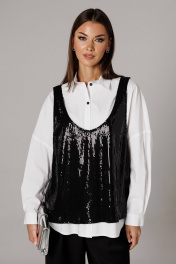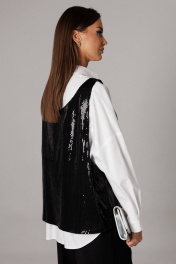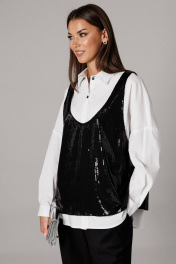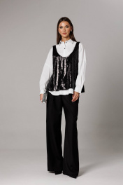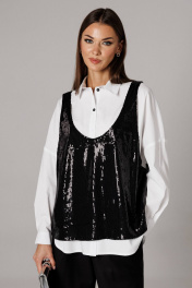 Блуза прямого свободного силуэта с рубашечным воротником на стойке и зауженным рукавом на манжете со спущенной линией плеча. Спереди на функциональной планке петли/пуговицы. Спинка изделия имеет горизонтальную плечевую кокетку (высота кокетки 20 см) и встречную складку для свободы движения. По плечевому шву заложена складка. Низ блузона слегка фигурный: спинка и полочка чуть длиннее бокового шва. Длина изделия блузона по спинке 73 см. Рукав рубашечный одношовный завершается манжетой (высота 5 см) с застежкой петля/пуговица. Длина спущенного плечевого шва 33 см. Длина рукава с манжетой 41 см. Майка выполнена из трикотажного полотна с пайетками свободного прямого силуэта в стиле оверсайз. Спереди и сзади имеет глубокие овальные вырезы и удлиненную линию проймы. Майка съемная. Длина изделия от плечевого шва по спинке 62 см. (фурнитура может отличаться от представленной на рекламном фотоматериале) Особые рекомендации: рекомендуется холодная деликатная ручная стирка, без использования отбеливающих СМС, без интенсивного трения. Сушка в вертикальном положении. ВТО с минимальным паром.