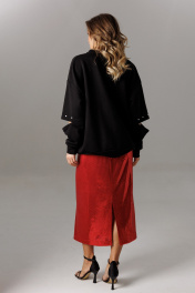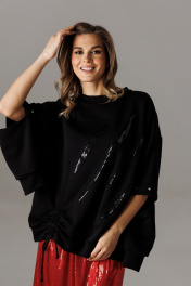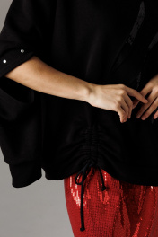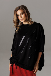 Блузон из трикотажного полотна свободного прямого силуэта. Линия плеча спущена, рукав прямой на зауженной манжете. Линия плеча состоит из притачного элемента: погона. Рукав основной состоит из двух деталей, в горизонтальном шве стачивания данных деталей расположен открытый разрез. По верхнему срезу расположены стразы. При желании длина рукава может трансформироваться и отверстием выступает открытый разрез. Длина рукава вместе с плечевой линией 75 см. Из них 13 см: длина плеча и 62 см: длина рукава. Высота манжета 5 см. На центральной части переда блузона расположены декоративные аппликационные элементы в виде ассиметричных полос из пайеток. Горловина округлая, оформлена притачной планкой, высотой 3 см. Низ блузона оканчивается притачной манжетой, высотой 6 см. Длина блузона по спинке изделия 70 см. Конструктивным элементом является вертикальная ассиметричная шнуровка для изменения низа свитшота.