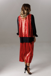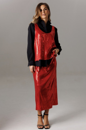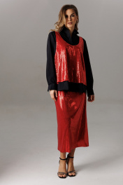 Блуза рубашечного покроя с втачным одношовным рукавом с манжетой. Спинка изделия состоит из горизонтальной кокетки и основной детали, на которой расположены две складки для свободы движения. Линия низа: фигурная. Рукав втачной, одношовный, с притачной манжетой, высотой 5,5 см и разрезом-планкой для петли/пуговицы. Высота планки- 11 см. Длина рукава в готовом виде 61 см. Горловина оформлена стойкой и рубашечным воротником. Застежка вертикальная на планках петли/пуговицы. Длина блузы по спинке 74-76 см (в зависимости от размерного ряда). Майка выполнена из трикотажного полотна с пайетками свободного прямого силуэта в стиле оверсайз. Спереди и сзади имеет глубокие овальные вырезы и удлиненную линию проймы. Майка съемная. Длина изделия по от плечевого шва по спинке 62 см. Юбка из трикотажного полотна с пайетками, прямого свободного силуэта на трикотажной подкладке. Линия талии оформлена притачным поясом на эластичной тесьме. Длина юбки по среднему шву спинки 79 см.