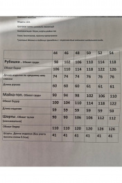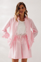 Стильный комплект, состоящий из свободной рубашки и шорт современного актуального кроя и майки-топа. Блуза рубашечного покроя с втачным одношовным рукавом с манжетой. Спинка изделия состоит из горизонтальной кокетки и основной детали, на которой расположены две складки для свободы движения. Линия низа: фигурная. Рукав втачной, одношовный, с притачной манжетой, высотой 5,5 см и разрезом-планкой для петли/ пуговицы. Высота планки 11 см. Длина рукава в готовом виде 61 см. Горловина оформлена стойкой с рубашечным воротником. Застежка вертикальная на планках петли/пуговицы. Длина блузы по спинке 74-76 см (в зависимости от размерного ряда). Майка-топ создана из трикотажного полотна, без рукавов. Горловина округлой формы. Срезы горловины и проймы обработаны косой бейкой. Ширина плеча 8 см. Длина по спинке 59 см. Шорты современного свободного силуэта. Карманы-хулиганы расположены в боковых швах. Спереди и сзади по линии талии расположены неглубокие модельные складки. Пояс притачной, высотой 5,5 см, с отделочной верхней планкой и шнуром, для фиксации объема талии. В пояс вставлена эластичная тесьма (резинка), высотой 3,5 см. Длина изделия шорт по боковому шву 41-43 см.