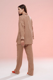 Стильный комплект, состоящий из блузы рубашечного силуэта и свободных брюк Блуза прямого свободного силуэта с рубашечным воротником на стойке, спущенной линии плеча и втачным рукавом на манжете с отворотом. В боковых швах расположены открытые разрезы, высотой 11 см. На левой стороне полочки находится накладной карман. Застежка петли-пуговицы расположена на фронтальной вертикальной планке. Длина изделия по спинке-73 см. Длина рукава от плечевой точки горловины-61 см(положение манжеты с отворотом). Брюки комплекта прямого силуэта. В боковых швах расположены внутренние наклонные карманы. Пояс со вставленной эластичной тесьмой, шириной 3 см. и дополнительным шнуром-кулисой для четкой фиксации объема талии. Длина брюк по боковому шву-112 см * фурнитура может отличаться от представленной на рекламном фотоматериале) Особые рекомендации: рекомендуется холодная деликатная ручная стирка, без использования отбеливающих СМС, без интенсивного трения. Сушка в вертикальном положении. ВТО с минимальным паром.