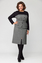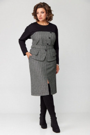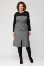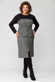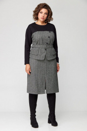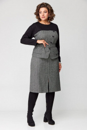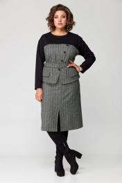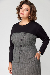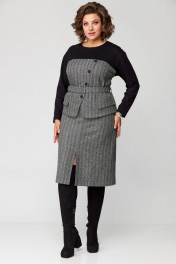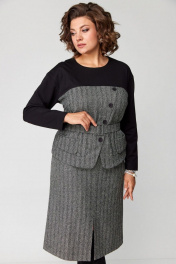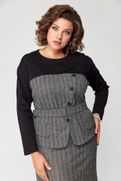 Комплект женский, состоящий из джемпера и юбки. Джемпер полуприлегающего силуэта, комбинированный из двух тканей- трикотаж и текстиль. Вырез горловины округлый, рукав длинный со спущенным плечом. Изделие выполнено с имитацией корсета, застежка декоративная, не функциональная. Юбка - умеренная трапеция с застежкой на тесьму-молнию. Пояс с резинкой по бокам. В комплекте пояс из основной ткани.