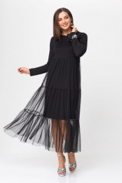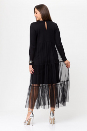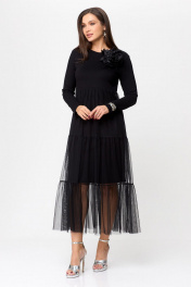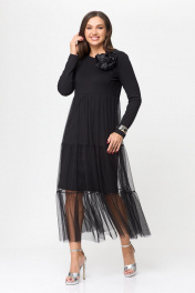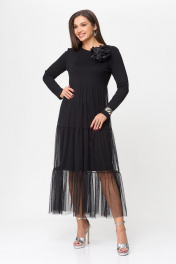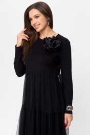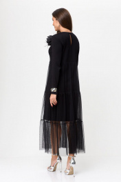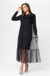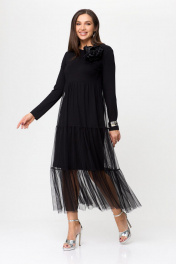 Платье женское свободного силуэта, двухслойное. Вырез горловины округлый, рукав втачной, длинный. Выше линии талии - подрез. Сзади в среднем шве спинки разрез(капля) с застежкой на петлю и пуговицу. Верхняя часть платья- сетка. Декором на изделии является брошь-цветок (съемный).