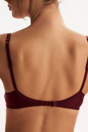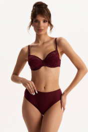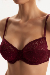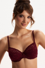 Бюстгальтер из эластичного кружева и эластичного трикотажного полотна. Чашка выполнена из эластичного кружева в нижней части присутствует дубляж. Бочки выполнены из эластичного трикотажного полотна. В модели присутствуют каркасы («косточки»).