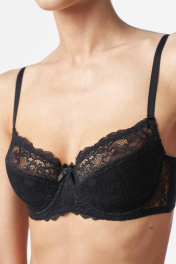 Кружевной бюстгальтер на дублированной основе (тонкий поролон) в нижней части чашки, декорированный кружевом по всей чашке. Бочки из эластичного трикотажного полотна (микрофибра) наполовину кружевные. В модели присутствуют каркасы («косточки»).
