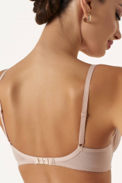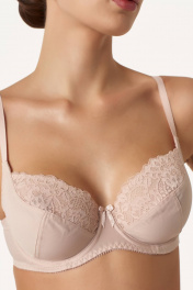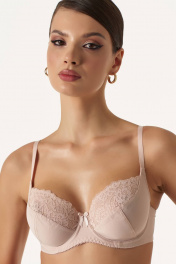 Бюстгальтер с мягкой чашкой, выполненный из эластичного трикотажного полотна и декорированный эластичным кружевом в верхней части чашки. В модели присутствуют каркасы ("косточки"). Бретели регулируются по длине. Ширина бретелей увеличивается пропорционально увеличению размера (1,0 см, 1,5 см, 2,0 см, 2,5 см). В самых маленьких размерах застежка на 1 крючок из двух позиций, в большинстве размеров застежка на 2 крючка из трех позиций; в больших размерах на 3 крючка с выбором из трех позиций. Важная особенность – тройное членение чашки, что обеспечивает скругление формы груди.