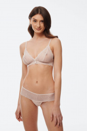 Стильный кружевной бюстгальтер бралетт с треугольными чашечками без каркасов («косточек»). Бретели регулируются по длине. Широкая застёжка на три крючка с тремя позициями для выбора. Бюстгальтер отлично сидит как на маленькой, так и на большой груди
