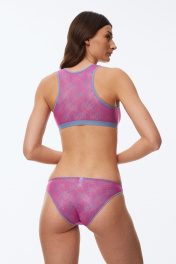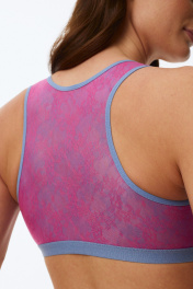 Бюстгальтер - топ выполнен из эластичного трикотажного полотна без каркасов («косточек») без застёжек. Деликатно облегает женское тело, не сдавливая плечи и грудь. Мягкая резинка по нижнему краю бюста удерживает бюстгальтер, не позволяя ему задираться. U-образная спинка снижает давление при ношении и делает топ-бюстгальтер удобным.