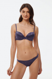 Бюстгальтер с формованной чашкой (эффект двойного «пуш-ап») на косточках, которые усиливают поддержку, приподнимая грудь, делая ее более полной и округлой. Выполнен полностью из эластичного трикотажного полотна. В качестве декоративного элемента присутствует маленький бантик спереди по центру изделия.