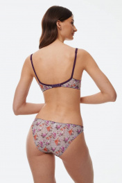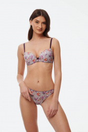 Бюстгальтер из эластичного трикотажного волокна (микрофибра). Формованная чашка (минимальный эффект «пуш-ап» каплевидной формы, расположенный в нижней части чашки) в модели присутствуют каркасы. В качестве декоративного элемента присутствует маленький бантик спереди по центру изделия. Бретели регулируются по длине, шириной 1,0 см. Застежка на крючки и петли 1х2 или 1х3.