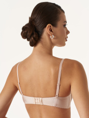Бюстгальтер «балконет» формованный (без эффекта «пуш-ап»). Чашка декорирована эластичным кружевом. В модели присутствуют каркасы («косточки»). Бочки из эластичного трикотажного полотна (микрофибра) наполовину кружевные. Бретели съёмные, регулируются по длине.