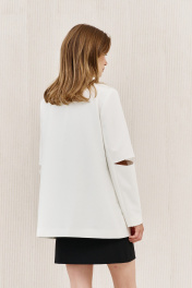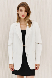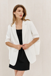 Жакет прямого силуэта на эластичной шелковистой подкладке. Перед с декоративными вытачками и функциональными карманами в рамку. Воротник пиджачного типа. Застежка центральная бортовая застегивающаяся на 2 декоративных пуговицы, край борта закруглен. Рукав длинный втачной с горизонтальным разрезом выше линии локтя.