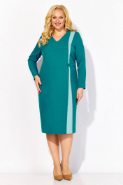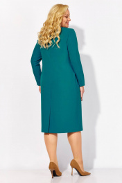 Повседневное платье на рост 164 см полуприлегающего силуэта. Вырез горловины V-образный. Рукав втачной длинный. Перед платья ассиметричного кроя, с одной стороны нагрудная вытачка из бокового шва, с другой – контрастная вставка между двумя рельефами из плеча, переходящими в складки. Платье дополнено патой с металлической нашивкой. Спинка платья со средним швом и плечевыми вытачками. В среднем шве потайная застежка молния и шлица