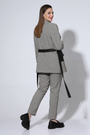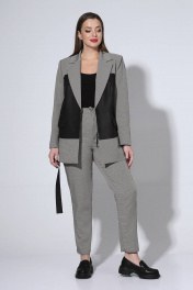 Комплект женский 2-х предметный: жакет и брюки. Костю выполнен из двух видов ткани: костюмно-плательного материала и эко кожи. Жакет слегка приталенного силуэта с центральной бортовой застежкой на 2 петли и пуговицы. Воротник пиджачного типа с отложными лацканами. По переду обработаны прорезные карманы с клапаном. Рукава втачные, двух шовные. Жакет на подкладке. Брюки зауженные к низу. На передних половинках брюк боковые карманы «хулиганы». Верхний срез брюк на притачном поясе, на резинке со шнуром из основной ткани. Длина жакета по середине спинки: 71 см. Длина рукава: 61 см. Длина брюк по боковому шву с учётом пояса: 102 см.