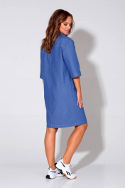 Платье прямого силуэта выполнено из хлопкового джинса. Линия плеча спущена. По переду верхние накладные нагрудные карманы. В нижней части платья прорезные карманы с листочкой. Центральная застежка на петли и пуговицы. Воротник рубашечного типа на отрезной стойке. Спинка со средним швом и отрезной кокеткой. Длинна платья по середине спинки: 97 см. Длина рукава: 37 см.