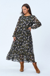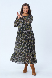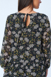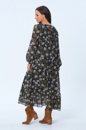 Шифоновое платье свободного силуэта на трикотажной подкладке. Горловина овальной формы, с разрезом и декоративными завязками по спинке. Платье отрезное с заниженной линией талии, с двумя широкими воланами на сборке. Рукав втачной. Низ рукава собран на эластичную тесьму. Длинна платья по спинке: 126 см. Длина рукава: 61 см.