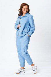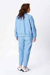Комплект женский 2-х предметный: брюки и куртка. Комплект выполнен из хлопкового джинса. Куртка на подкладке. Центральная застежка на петли и пуговицы. По переду наклонные карманы с листочкой в области талии. Спинка цельная. По низу куртки притачной пояс с резинкой, воротник отложной на цельнокроеной стойке. Рукава втачные одно-шовные, по низу на манжете с резинкой. Брюки на притачном поясе, от середины передних половинок и по спинке на резинке, заужены к низу. Застежка брюк спереди по типу «гульфик». По бокам карманы с наклонным входом. Сзади накладные карманы. Длина брюк по боковому шву: 97 см. Длина куртки по центру спинки: 59 см. Длина рукава: 59 см.