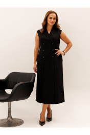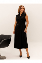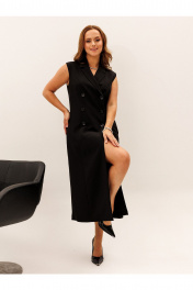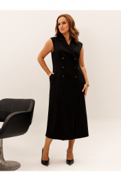 Платье-жилет подходит как для офиса, так и для вечерних выходов или праздничных мероприятий. Модель прекрасно сочетается с водолазками, рубашками, блузами. Платье-жилет можно носить с брюками, шортами и юбками. Двубортное платье-жилет приталенного силуэта с застёжкой на петли и пуговицы. Воротник пиджачного типа. Линия плеча расширенная. По переду и спинке от проймы и до низа идут продольные рельефы. Спинка со средним швом и шлицей. В боковых швах карманы. Изделие на подкладке. Длинна по середине спинки: 121 см.