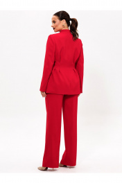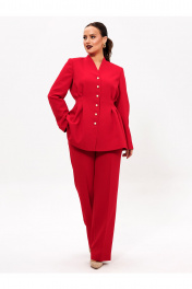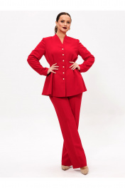 Комплект женский 2-х предметный: жакет и брюки. Жакет выполнен из костюмной ткани. Жакет Х-образного силуэта, длиной чуть ниже линии бёдер. Спереди центральная застежка на петли и пуговицы. По переду и спинке в области талии заложены складки. Спинка со средним швом. Воротник - цельнокроеная стойка. Рукав втачной двух шовный. Жакет на подкладке. Брюки прямого кроя. На передних половинках небольшая складка, переходящая в стрелку. Верхний срез брюк обработан притачным поясом, по бокам вставлена резинка, имеются шлёвки под ремень. Застёжка брюк по типу «гульфик». В боковых швах карманы «хулиганы». На задних половинках брюк вытачки. Длина жакета по середине спинки: р.44-48 - 71 см., р.50-54 - 73 см. Длина рукава: 62 см. Длина брюк по боковому шву: р.44-48 - 112 см., р.50 -54 114 см.
