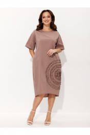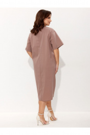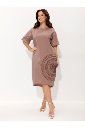 Платье “бочонок” длинной миди со спущенной линией плеча. Горловина округлой формы. Низ платья фигурный (перед немного короче спинки). По переду платья декоративный элемент в виде цветка, который придаёт особый шарм и уникальность. В боковых швах карманы. Спинка со средним швом. Платье “бочонок” скроет недостатки фигуры в области живота и бёдер делая силуэт женственным и визуально выравнивает пропорции. Длина платья по середине спинки: 110 см. Длина рукава от горловины: 38 см.