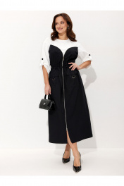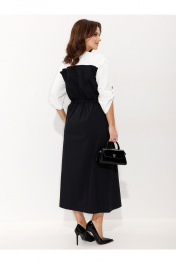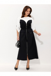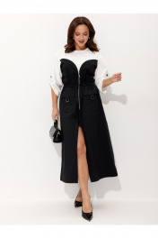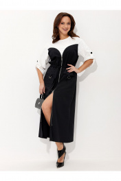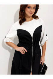 Комфорт - один из ключевых трендов современной действительности, который отлично реализуется в контексте стиля «спорт-кэжуал». Его выбирает тот, кто не желает ограничивать себя жёсткими рамками, стремится выглядеть модно и динамично и не считает, что красота требует жертв. Платье выполнено из двух видов ткани: трикотажа (верхняя часть лифа платья и рукава) и хлопка (нижняя часть лифа платья и юбка). Платье отрезное по линии талии на кулисе, в которую вставлен пояс-завязка что позволяет регулировать приталивание. По переду платья от проймы вставлена декоративная молния с двумя бегунками, что позволяет регулировать высоту разреза. Спереди накладные карманы с клапаном и патой декорированной металлическим полукольцом. Спущенная линия плеча. Низ рукава поддерживается декоративной патой на петлю и пуговицу.
