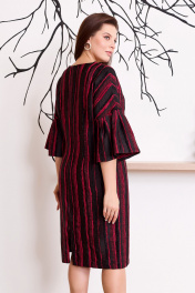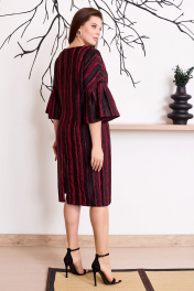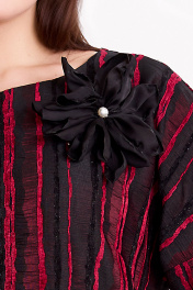 Эффектное платье футляр прямого силуэта с дизайнерскими рукавами и съемной брошью ручной работы. Платье на основе цельнокроеного покроя полуприлегающего силуэта с округлым вырезом выполнено из крешованной тафты с бархатными вплетениями, вертикальные полоски вытягивают силуэт и заужают фигуру. Перед оформлен нагрудными вытачками и украшен съемной брошью. Брошь цветок выполнена вручную из нежного шелк атласа с матовым блеском. Спинка со средним швом и талиевыми вытачками. Застежка на потайную молнию в среднем шве спинки, по низу разрез. Рукав на основе кимоно , с притачной деталью со встречными складками .