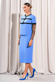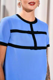 Блуза с округлым вырезом горловины. Перед с декоративными отрезными деталями и бантами контрастного цвета. Спинка с потайной молнией в среднем шве. Рукава втачные с контрастной отделочной деталью по низу. Юбка на поясе с резинкой. Заднее полотнище с потайной молнией и шлицей в среднем шве. Юбка на подкладке. ВОЗМОЖНА ЗАМЕНА ФУРНИТУРЫ НА АНАЛОГИЧНУЮ ТАКОГО ЖЕ КАЧЕСТВА.