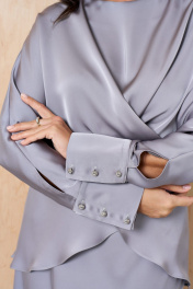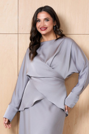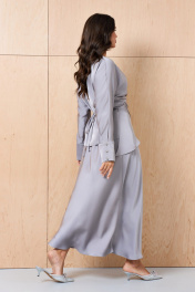 Костюм юбочный Блуза с цельнокроеными рукавами и фигурным низом. Манжеты рукавов с пуговицами по низу. Изделие с разрезами по боковым швам и завязками по спинке. Юбка на обтачке и с застёжкой на молнию по боковому шву.
