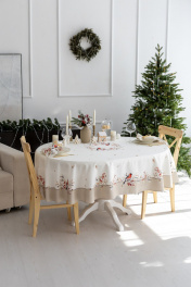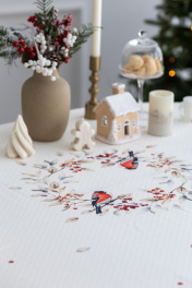 Скатерть "Пернатые истории", 100% хлопок/ Все скатерти коллекции «ПЕРНАТЫЕ ИСТОРИИ» выполнены из ткани для столового белья плотностью 180 г/кв.м и имеют специальную пропитку (влаго-, масло- и грязеотталкивающую обработку). Принт на ткани нанесен методом цифровой печати с использованием высококачественных красителей, благодаря чему изделия не линяют и не меняют свой цвет после многократных стирок. Рисунок по ткани виден только на лицевой стороне. ЭКСКЛЮЗИВНЫЙ ДИЗАЙН:Коллекция «Пернатые истории» — это зимняя сказка, сотканная из тепла, уюта и волшебства. В её центре — трогательные образы птиц, уютно устроившихся на заснеженных ветвях с яркими ягодами, словно наблюдающих за тем, как дом наполняется ожиданием праздника. «Пернатые истории» — это не просто декор. Это приглашение замедлиться, зажечь свечи, налить горячий чай и встретить Новый год в окружении красоты, вдохновлённой природой. УХОД ЗА ИЗДЕЛИЕМ: Изделия из натуральных тканей требуют особого ухода. Стирка при температуре 30 С; деликатный отжим (чтобы уменьшить смятость изделия), гладить изделия полувлажными при максимальной температуре, не отбеливать. Если при использовании изделий было нанесено пятно, рекомендуем испачканное изделие постирать не позднее следующего дня, т.к. натуральные нити ткани быстро впитывают натуральные красители еды и напитков (чай, кофе, соусы). При стирке изделий допускается использование пятновыводящих средств для цветного белья. После стирки возможна усадка изделия на 3-5%.