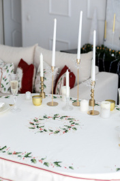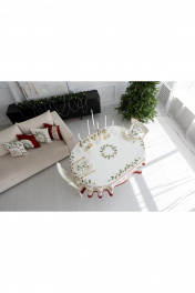Скатерть "Элегант", 100% хлопок. Все скатерти коллекции «ЭЛЕГАНТ» выполнены из ткани для столового белья плотностью 180г/кв.м и имеют специальную пропитку (влаго-, масло- и грязеотталкивающую обработку). Принт на ткани нанесен методом цифровой печати с использованием высококачественных красителей, благодаря чему изделия не линяют и не меняют свой цвет после многократных стирок. Рисунок по ткани виден только на лицевой стороне. ЭКСКЛЮЗИВНЫЙ ДИЗАЙН: классический орнамент из веточек остролиста и красных ягод, дополненный элегантной каймой в красно-золотых тонах. Идеально подходит для новогодних и рождественских ужинов, семейных торжеств и уютных вечеров. Создайте атмосферу волшебства за вашим столом! УХОД ЗА ИЗДЕЛИЕМ: Изделия из натуральных тканей требуют особого ухода. Стирка при температуре 30 С; деликатный отжим (чтобы уменьшить смятость изделия), гладить изделия полувлажными при максимальной температуре, не отбеливать. Если при использовании изделий было нанесено пятно, рекомендуем испачканное изделие постирать не позднее следующего дня, т.к. натуральные нити ткани быстро впитывают натуральные красители еды и напитков (чай, кофе, соусы). При стирке изделий допускается использование пятновыводящих средств для цветного белья. После стирки возможна усадка изделия на 3-5%.