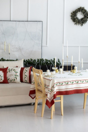 Скатерть "Элегант", 100% хлопок. Все скатерти коллекции «ЭЛЕГАНТ» выполнены из ткани для столового белья плотностью 180г/кв.м и имеют специальную пропитку (влаго-, масло- и грязеотталкивающую обработку). Принт на ткани нанесен методом цифровой печати с использованием высококачественных красителей, благодаря чему изделия не линяют и не меняют свой цвет после многократных стирок. Рисунок по ткани виден только на лицевой стороне. ЭКСКЛЮЗИВНЫЙ ДИЗАЙН: классический орнамент из веточек остролиста и красных ягод, дополненный элегантной каймой в красно-золотых тонах. Идеально подходит для новогодних и рождественских ужинов, семейных торжеств и уютных вечеров. Создайте атмосферу волшебства за вашим столом! УХОД ЗА ИЗДЕЛИЕМ: Изделия из натуральных тканей требуют особого ухода. Стирка при температуре 30 С; деликатный отжим (чтобы уменьшить смятость изделия), гладить изделия полувлажными при максимальной температуре, не отбеливать. Если при использовании изделий было нанесено пятно, рекомендуем испачканное изделие постирать не позднее следующего дня, т.к. натуральные нити ткани быстро впитывают натуральные красители еды и напитков (чай, кофе, соусы). При стирке изделий допускается использование пятновыводящих средств для цветного белья. После стирки возможна усадка изделия на 3-5%.