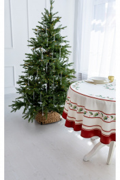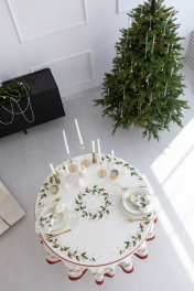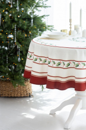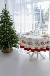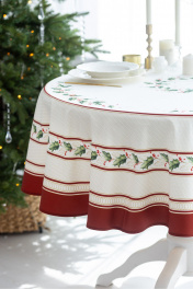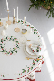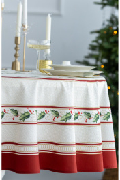 Скатерть "Элегант", 100% хлопок. Все скатерти коллекции «ЭЛЕГАНТ» выполнены из ткани для столового белья плотностью 180г/кв.м и имеют специальную пропитку (влаго-, масло- и грязеотталкивающую обработку). Принт на ткани нанесен методом цифровой печати с использованием высококачественных красителей, благодаря чему изделия не линяют и не меняют свой цвет после многократных стирок. Рисунок по ткани виден только на лицевой стороне. ЭКСКЛЮЗИВНЫЙ ДИЗАЙН: классический орнамент из веточек остролиста и красных ягод, дополненный элегантной каймой в красно-золотых тонах. Идеально подходит для новогодних и рождественских ужинов, семейных торжеств и уютных вечеров. Создайте атмосферу волшебства за вашим столом! УХОД ЗА ИЗДЕЛИЕМ: Изделия из натуральных тканей требуют особого ухода. Стирка при температуре 30 С; деликатный отжим (чтобы уменьшить смятость изделия), гладить изделия полувлажными при максимальной температуре, не отбеливать. Если при использовании изделий было нанесено пятно, рекомендуем испачканное изделие постирать не позднее следующего дня, т.к. натуральные нити ткани быстро впитывают натуральные красители еды и напитков (чай, кофе, соусы). При стирке изделий допускается использование пятновыводящих средств для цветного белья. После стирки возможна усадка изделия на 3-5%.