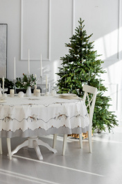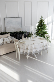 Скатерть "Стоун", 100% хлопок. Все скатерти коллекции «СТОУН» выполнены из ткани для столового белья плотностью 180г/кв.м и имеют специальную пропитку (влаго-, масло- и грязеотталкивающую обработку). Принт на ткани нанесен методом цифровой печати с использованием высококачественных красителей, благодаря чему изделия не линяют и не меняют свой цвет после многократных стирок. Рисунок по ткани виден только на лицевой стороне. ЭКСКЛЮЗИВНЫЙ ДИЗАЙН: гармония природной сдержанности и торжественной эстетики. Белоснежный фон с изысканным принтом в виде еловых веток и шишек создаёт атмосферу зимнего леса, наполненного светом и теплом. Идеальный выбор для тех, кто ценит стиль, уют и внимание к деталям. УХОД ЗА ИЗДЕЛИЕМ: Изделия из натуральных тканей требуют особого ухода. Стирка при температуре 30 С; деликатный отжим (чтобы уменьшить смятость изделия), гладить изделия полувлажными при максимальной температуре, не отбеливать. Если при использовании изделий было нанесено пятно, рекомендуем испачканное изделие постирать не позднее следующего дня, т.к. натуральные нити ткани быстро впитывают натуральные красители еды и напитков (чай, кофе, соусы). При стирке изделий допускается использование пятновыводящих средств для цветного белья. После стирки возможна усадка изделия на 3-5%.