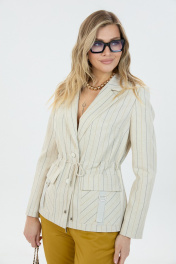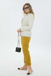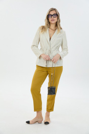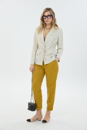 Комплект 2ка,состоящий из жакета и брюк. Однобортный жакет на подкладке прямого силуэта с застёжкой на две петли и пуговицы. По талии расположена кулиса и шнурок для приталивания жакета. По переду расположены накладные карманы с клапаном и декором. Длина жакета по спинке 68-72 см. Брюки свободного прилегания по бедрам и зауженные к низу. Пояс на эластичной тесьме с кулисой и втянутым шнурком. Вход в карман фигурный, наклонный к боковому шву.