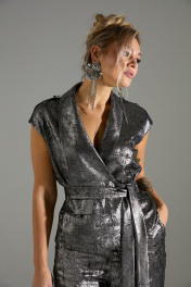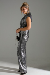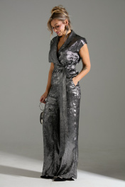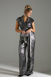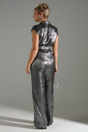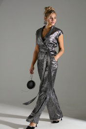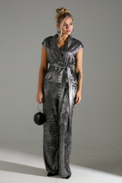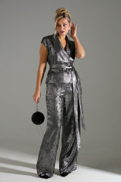 Комплект 2ка, состоящий из жилета и брюк. Жилет с отложным воротником и поясом. Перед жилета на запах с застёжкой на кнопки, на плечах декоративные паты. По бокам жилета выполнена имитация клапанов карманов. Брюки прямого силуэта на эластичной резинке по талии. По переду расположены карманы с наклонным входом.