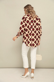 Комплект 2ка, состоящий из рубашки и брюк. Рубашка женская большого объема, прямого силуэта. На детали спинки расположена двойная кокетка, переходящая на деталь полочки. Под кокеткой на спинке встречная складка. Воротник рубашечный отложной на стойке. Застежка планка центральная на прорезные петли и пуговицы. Линия плеча спущенная, рукав рубашечный, длинный. В нижней части рукава заложены складки, заканчивается манжетой с двумя прорезными петлями и пуговицами. Низ блузки разноуровневый: спереди короче, сзади длиннее. Зауженные брюки с подворотами по низу. Пояс на эластичной тесьме с кулисой и втянутым шнурком. Вход в карман фигурный, наклонный к боковому шву.