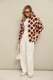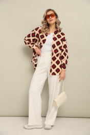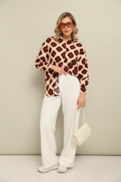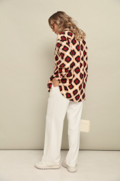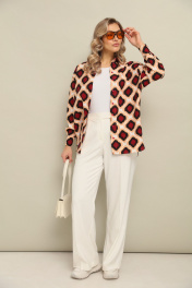 Комплект 2ка, состоящий из рубашки и брюк. Рубашка женская большого объема, прямого силуэта. На детали спинки расположена двойная кокетка, переходящая на деталь полочки. Под кокеткой на спинке встречная складка. Воротник рубашечный отложной на стойке. Застежка планка центральная на прорезные петли и пуговицы. Линия плеча спущенная, рукав рубашечный, длинный. В нижней части рукава заложены складки, заканчивается манжетой с двумя прорезными петлями и пуговицами. Низ блузки разноуровневый: спереди короче, сзади длиннее. Брюки широкого объема, прямого силуэта. На передних половинках брюк заутюжены стрелки, переходящие в складки по линии талии. На задних половинках также заутюжены стрелки. В боковых швах расположены карманы. Застежка-гульфик. Пояс отрезной, притачной. В задней части пояса вставлена эластичная тесьма (резинка). На пояс настрочены шлевки. Выступающая часть пояса застегивается на петлю и крючок.