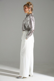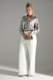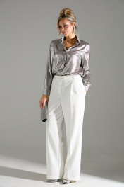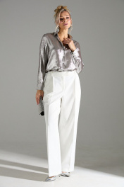 Комплект 2-ка, состоящий из блузы и брюк. Блузка прямого силуэта из ткани с приятной к телу ткани с вискозной изнанкой и блестящей лицевой стороной. Воротник рубашечного типа, застежка на прорезные петли и пуговицы. В нижней части рукава заложены складки, манжета на двух пуговицах. Брюки широкого объема, прямого силуэта. На передних половинках брюк заутюжены стрелки, переходящие в складки по линии талии. На задних половинках также заутюжены стрелки. В боковых швах расположены карманы. Застежка-гульфик. Пояс отрезной, притачной. В задней части пояса вставлена эластичная тесьма (резинка). На пояс настрочены шлевки. Выступающая часть пояса застегивается на петлю и крючок.