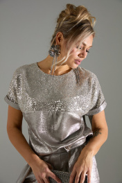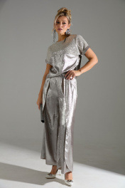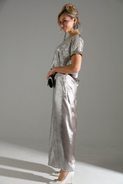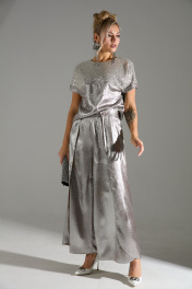 Комплект 2-ка из лёгкой ткани, состоящий из блузки и брюк. Блузка свободного объёма с короткими цельнокроеными рукавами с подворотами. Вырез горловины круглый. По переду подрез ниже линии груди. Верх блузки по переду выполнен из ткани расшитой пайетками. Широкие брюки-кюлоты свободного оригинального кроя с застёжкой на пуговицы. Без карманов.