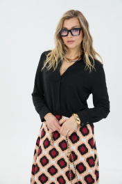 Комплект 2ка, состоящий из блузки и юбки. Блузка свободного силуэта с ассиметричным низом - спереди короче, сзади длиннее. Вырез горловины V-образный, воротник рубашечного типа. По низу переда блузки вставлена резинка. Манжеты с застёжкой на две пуговицы. Юбка кроя трапеция, длины "макси". Пояс юбки по спинке на резинке, сбоку застёжка на потайную молнию и пуговицу.